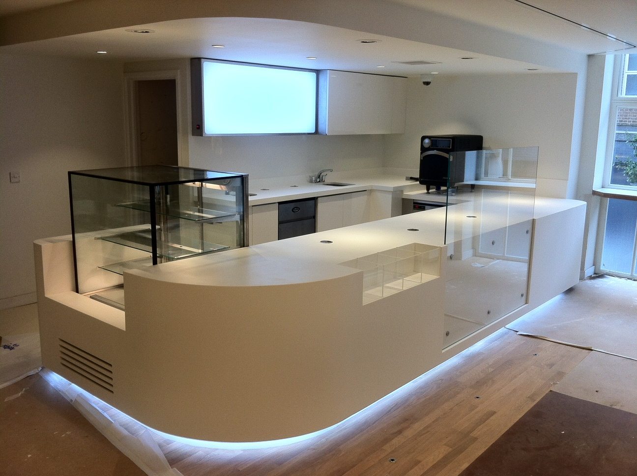 The project included bespoke heated and chilled displays. We finished the counters to the highest specification including Blanco Zeus Silestone worktops, high gloss curved laminate fascia panels and UV Bonded glass display boxes to the heated and chilled displays.